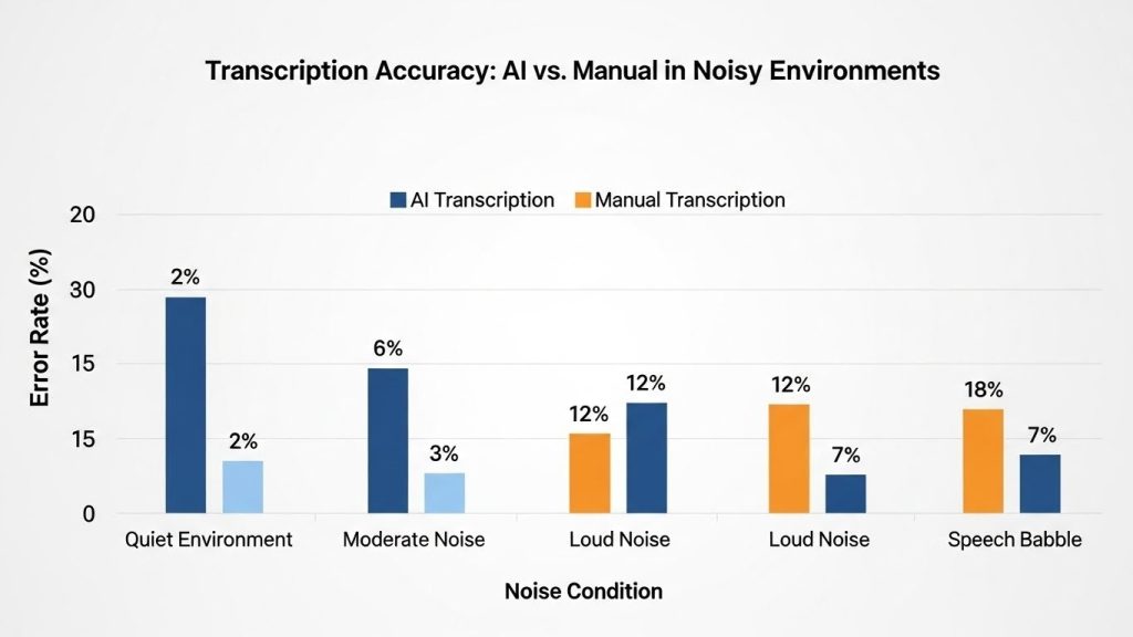 Background noise is a killer. Imagine trying to transcribe a podcast in a noisy cafe—AI might mix up “bear” with “beer” or worse. Studies show that with clean audio, accuracy jumps to 95%, but add echoes or chatter, and it drops to 80-85%. Manual typing? A skilled person can filter that out mentally, keeping errors low.